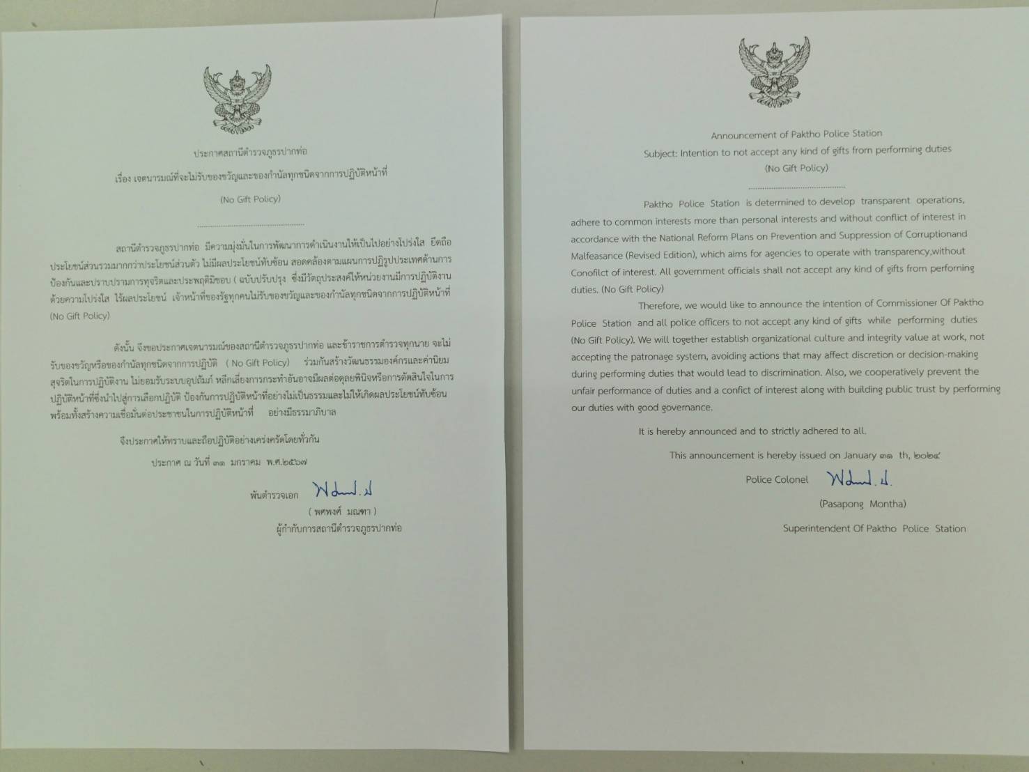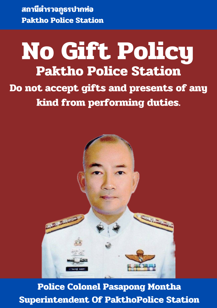 - ประกาศสำนักงานยุทธศาสตร์ตำรวจเรื่องเจตนารมณ์ที่จะไม่รับของขวัญหรือของกำนัลทุกชนิดจากการปฏิบัติหน้าที่